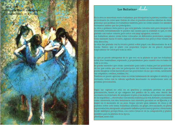 En la obra se muestran cuatro bailarinas, que interpretan la pintura, vestidas con un vestuario de color azul. Detrás de ellas se pueden observar siluetas de otras personas que podrían ser bailarinas también, pero no están usando los mismos vestuarios azules que las principales.