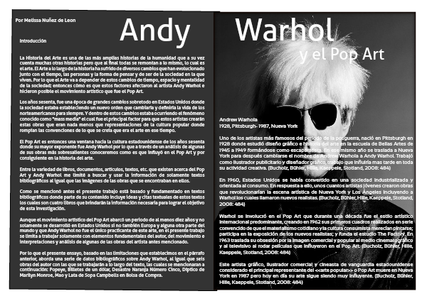 Entre la variedad de libros, documentos, artículos, textos, etc. que existen acerca del Pop Art y Andy Warhol me limité a buscar y usar la información de solamente textos bibliográficos al igual que las imágenes de las obras que se encontraban en ellos.