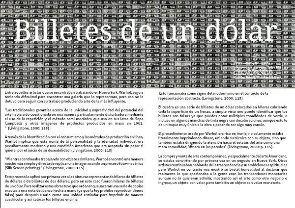 "Las tradicionales garantías acerca de la unicidad y expresividad del potencial del arte había sido cuestionada en una manera particularmente disturbadora mediante el uso de la repetición y el método semi mecánico que uso en sus latas de Sopa Campbells y otras imágenes de productos producidos en masa en 1962. " (Livingstone, 2000: 115)