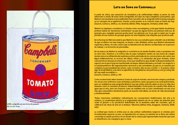 "Estas creaciones cambiaban radicalmente las concepciones tradicionales del arte y la estética. La creatividad artística y la originalidad dejaron de ser el centro de atención para ceder el puesto a los productos industriales de la moderna edad del consumo, que se calificaron de obras de arte en sí mismas." (Bucholz, Bühler, Hille, Kaeppele, Stotland, 2008: 485)