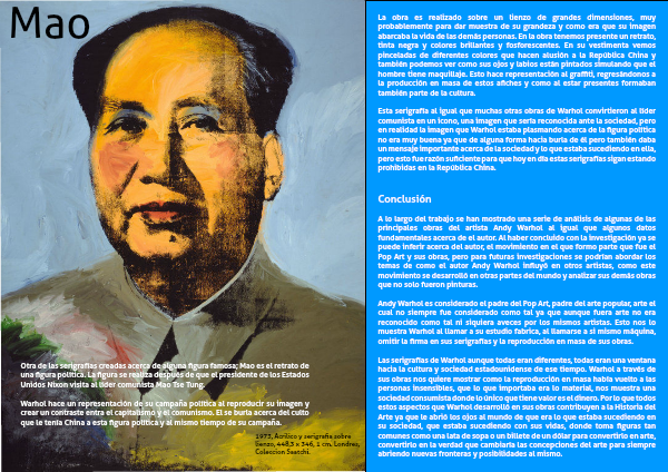 Otra de las serigrafías creadas acerca de alguna figura famosa; Mao es el retrato de una figura política. La figura se realiza después de que el presidente de los Estados Unidos Nixon visita al líder comunista Mao Tse Tung.