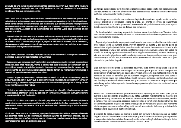 Lucía miró por la muy pequeña ventana, perdiéndose en el mar de nubes y en el azul celestial que te hace sentir que estás en un sueño ya que así era. Le dolía el cuello por estar tanto tiempo torcida mirando por la ventana que al final decidió recargarse en el asiento no tan cómodo de color azul, pero al contrario del que estaba allá afuera este era oscuro. A pesar de la incomodidad del asiento Lucía cayó dormida en un profundo sueño.