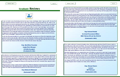 Enrollment as an IE graduate was my first encounter with this field. With time I realized it is combination of managerial work along with combination of improvement in every aspect either is human aspect, process and product aspect. IE is a renowned field in world but in Pakistan it’ s a new filed and need new faces to make people more awarded about the help an IE can towards organization objective achievement efficiently. Previously I thought the things are the way they are but now I consider those aspects which can be renovated.