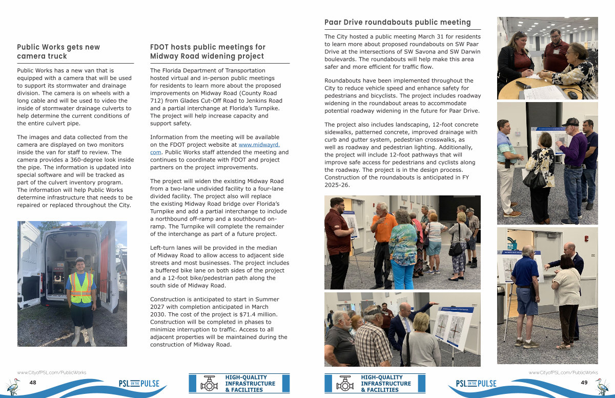 The project also includes landscaping, 12-foot concrete sidewalks, patterned concrete, improved drainage with curb and gutter system, pedestrian crosswalks, as well as roadway and pedestrian lighting. Additionally, the project will include 12-foot pathways that will improve safe access for pedestrians and cyclists along the roadway. The project is in the design process. Construction of the roundabouts is anticipated in FY 2025-26. www. CityofPSL. com / PublicWorks
