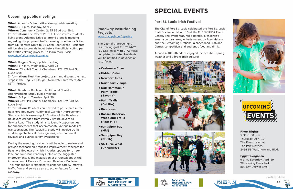 What: Atlantus Drive traffic-calming public meeting When: 5-6 p. m. Monday, April 7 Where: Community Center, 2195 SE Airoso Blvd. Information: The City of Port St. Lucie invites residents living along Atlantus Drive to attend a public meeting regarding the proposed traffic calming on Atlantus Drive from SE Floresta Drive to SE Coral Reef Street. Residents will be able to provide input before the official voting per the traffic-calming process. To learn more, visit www. cityofpsl. com / trafficcalming.