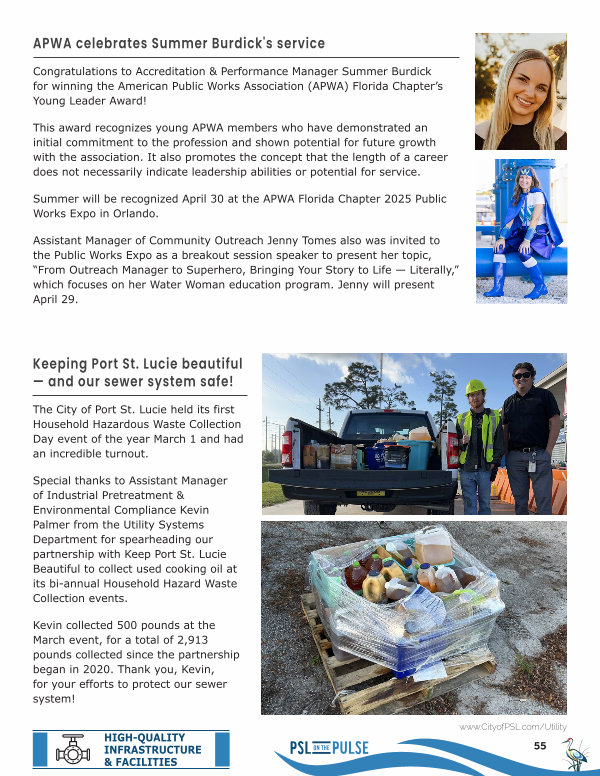 Special thanks to Assistant Manager of Industrial Pretreatment & Environmental Compliance Kevin Palmer from the Utility Systems Department for spearheading our partnership with Keep Port St. Lucie Beautiful to collect used cooking oil at its bi-annual Household Hazard Waste Collection events.