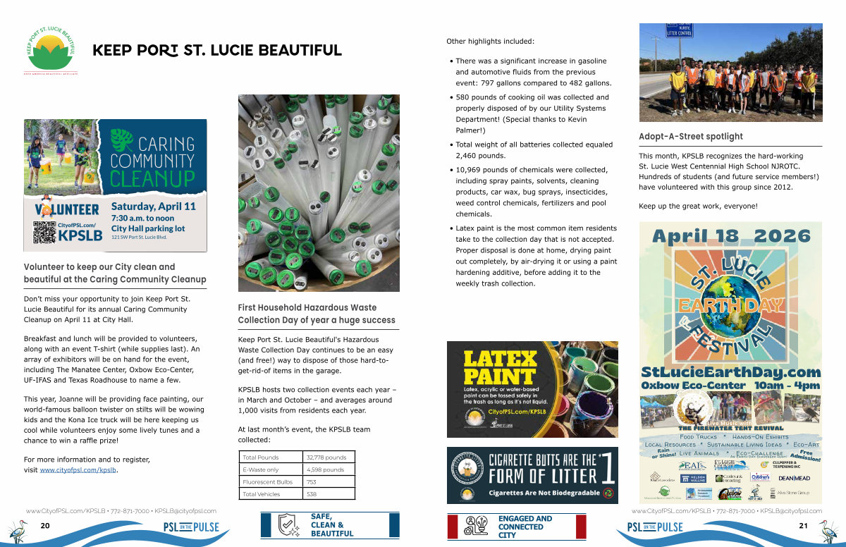 Don’ t miss your opportunity to join Keep Port St. Lucie Beautiful for its annual Caring Community Cleanup on April 11 at City Hall.