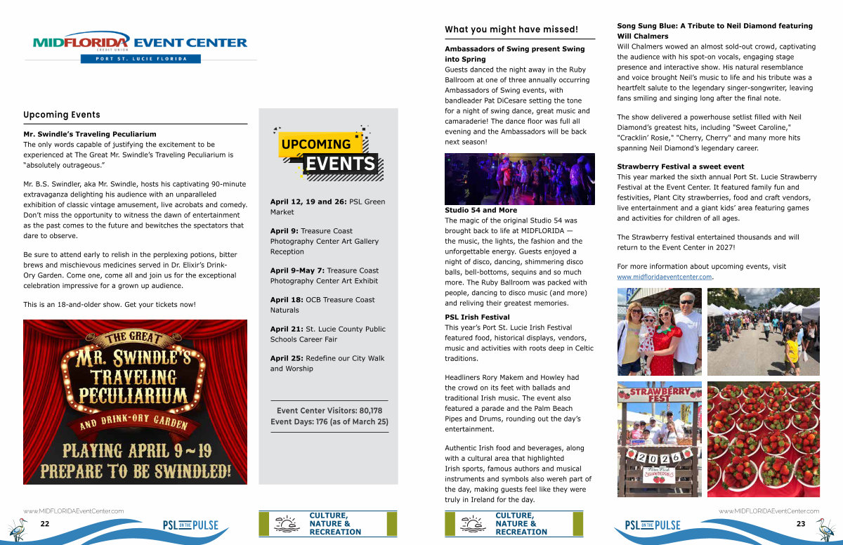Strawberry Festival a sweet event This year marked the sixth annual Port St. Lucie Strawberry Festival at the Event Center. It featured family fun and festivities, Plant City strawberries, food and craft vendors, live entertainment and a giant kids’ area featuring games and activities for children of all ages.