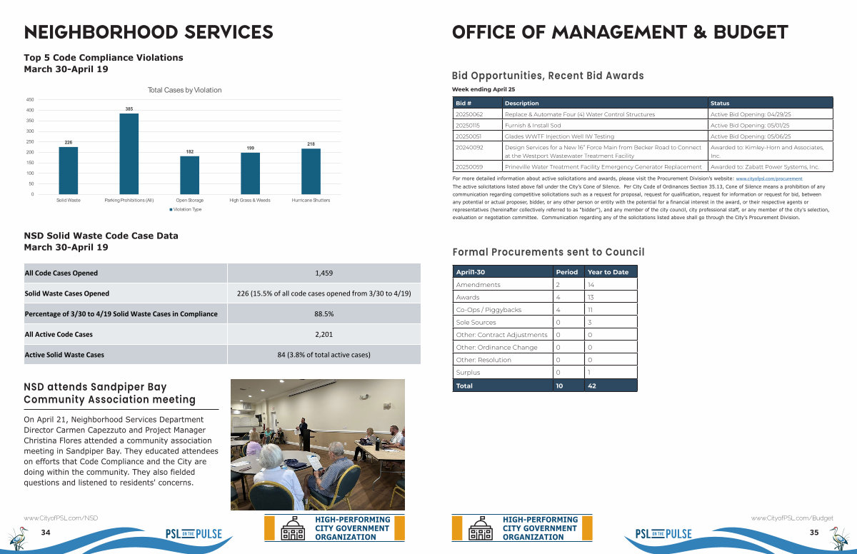 On April 21, Neighborhood Services Department Director Carmen Capezzuto and Project Manager Christina Flores attended a community association meeting in Sandpiper Bay. They educated attendees on efforts that Code Compliance and the City are doing within the community. They also fielded questions and listened to residents ' concerns.