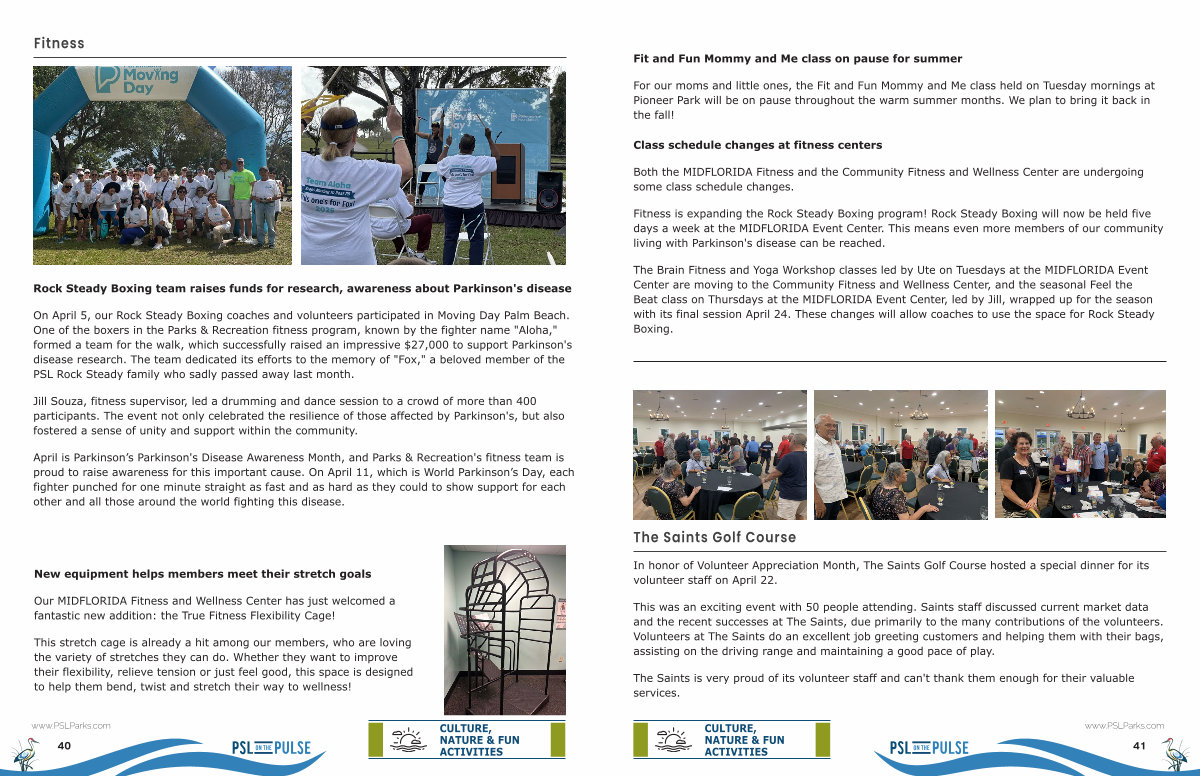 On April 5, our Rock Steady Boxing coaches and volunteers participated in Moving Day Palm Beach. One of the boxers in the Parks & Recreation fitness program, known by the fighter name " Aloha," formed a team for the walk, which successfully raised an impressive $ 27,000 to support Parkinson ' s disease research. The team dedicated its efforts to the memory of " Fox," a beloved member of the PSL Rock Steady family who sadly passed away last month.