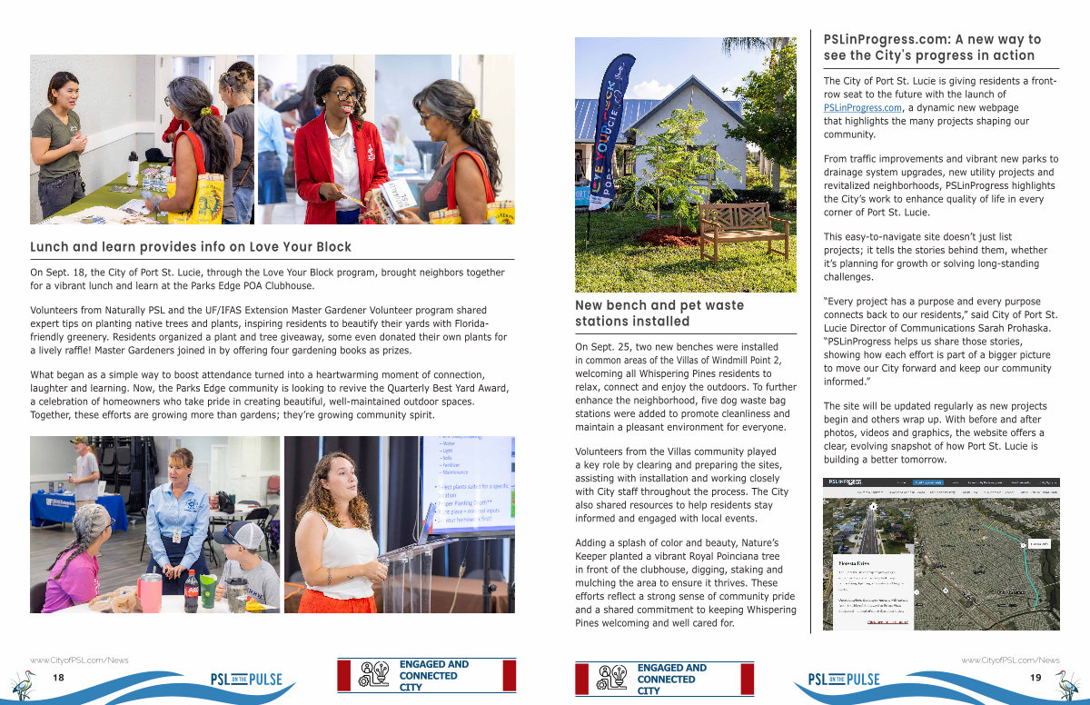 “ Every project has a purpose and every purpose connects back to our residents,” said City of Port St. Lucie Director of Communications Sarah Prohaska.“ PSLinProgress helps us share those stories, showing how each effort is part of a bigger picture to move our City forward and keep our community informed.”