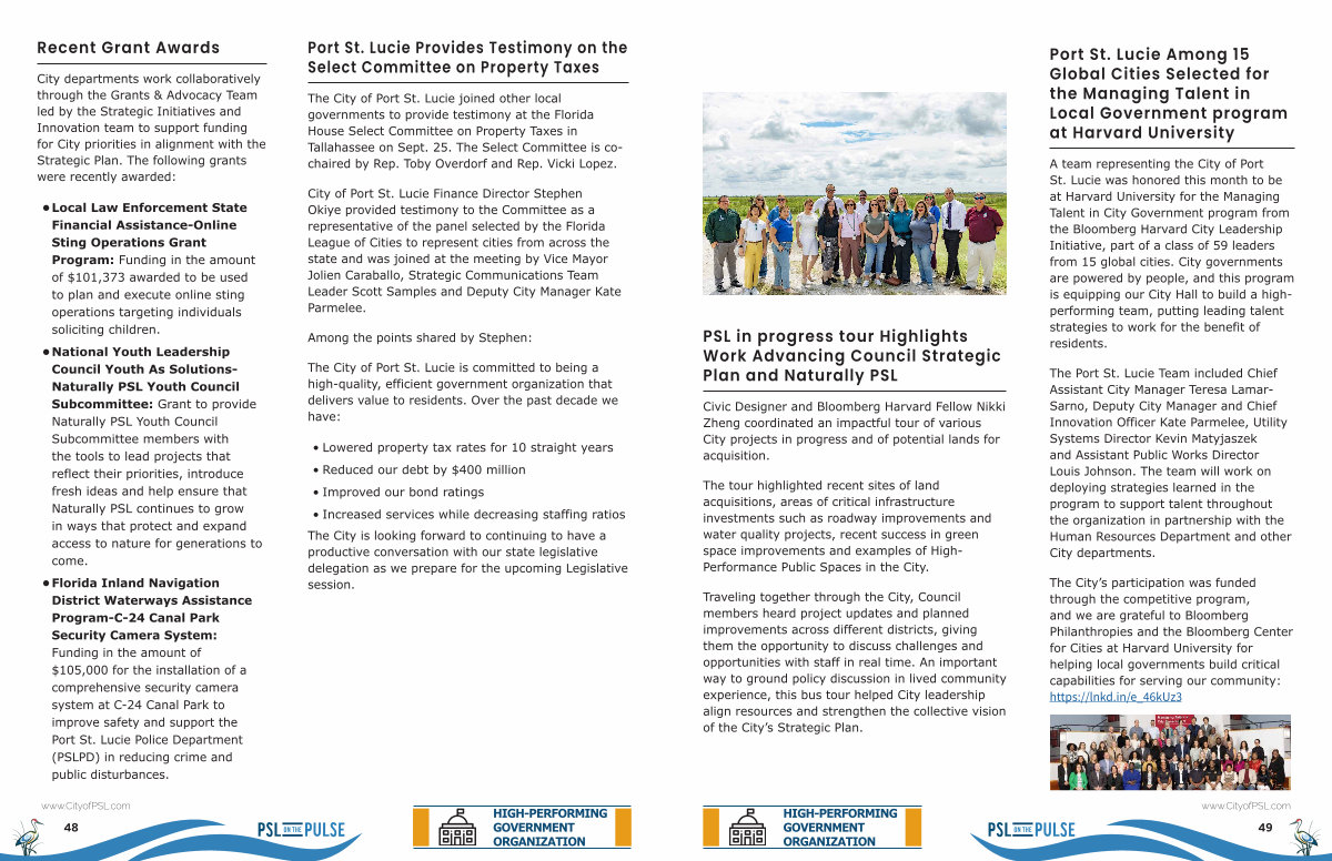 A team representing the City of Port St. Lucie was honored this month to be at Harvard University for the Managing Talent in City Government program from the Bloomberg Harvard City Leadership Initiative, part of a class of 59 leaders from 15 global cities. City governments are powered by people, and this program is equipping our City Hall to build a highperforming team, putting leading talent strategies to work for the benefit of residents.