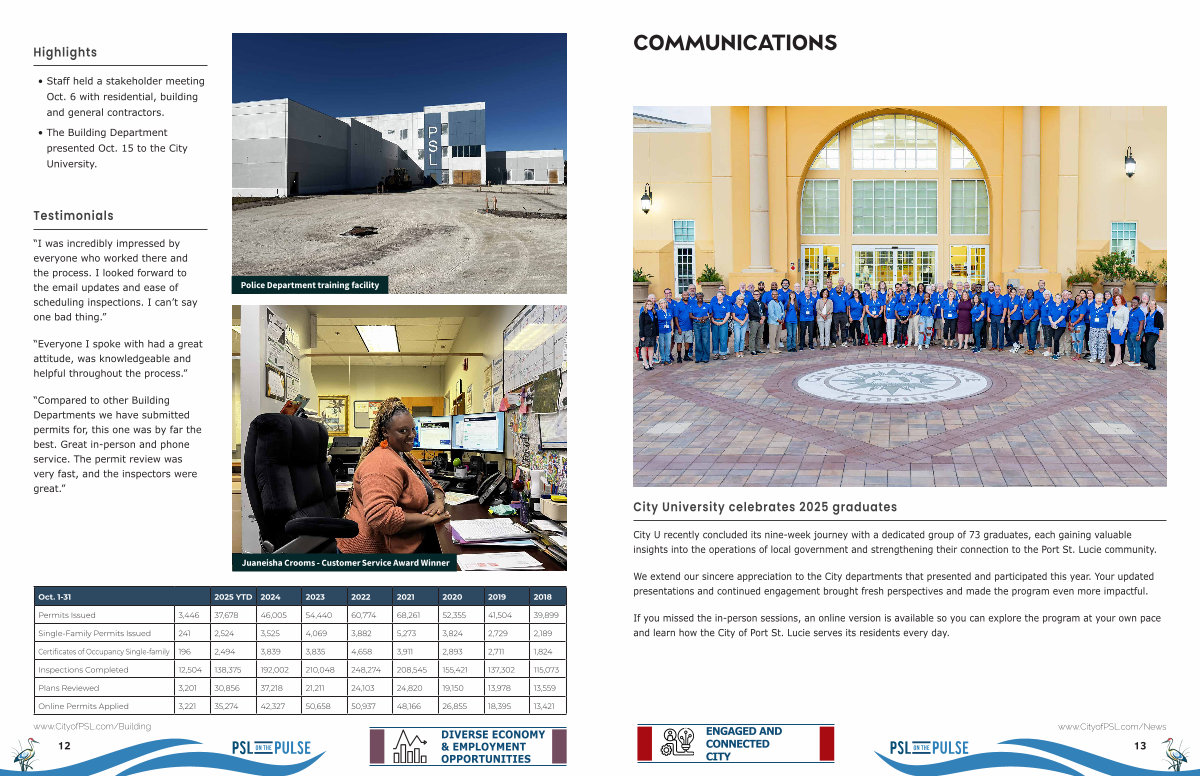 Oct. 1-31 2025 YTD 2024 2023 2022 2021 2020 2019 2018 Permits Issued 3,446 37,678 46,005 54,440 60,774 68,261 52,355 41,504 39,899 Single-Family Permits Issued 241 2,524 3,525 4,069 3,882 5,273 3,824 2,729 2,189 Certificates of Occupancy Single-family 196 2,494 3,839 3,835 4,658 3,911 2,893 2,711 1,824 Inspections Completed 12,504 138,375 192,002 210,048 248,274 208,545 155,421 137,302 115,073 Plans Reviewed 3,201 30,856 37,218 21,211 24,103 24,820 19,150 13,978 13,559 Online Permits Applied 3,221 35,274 42,327 50,658 50,937 48,166 26,855 18,395 13,421 www. CityofPSL. com / Building