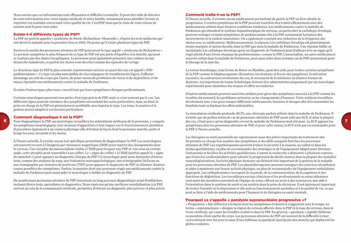 Certains neurologues peuvent vous parler d’ un type précis de PSP, mais ce n’ est souvent pas le cas. Les différents types peuvent entraîner des symptômes nécessitant des soins particuliers, mais, au final, la prise en charge de la PSP est généralement semblable, peu importe le type. Les soins, le soutien et la gestion seront adaptés à vos besoins particuliers.