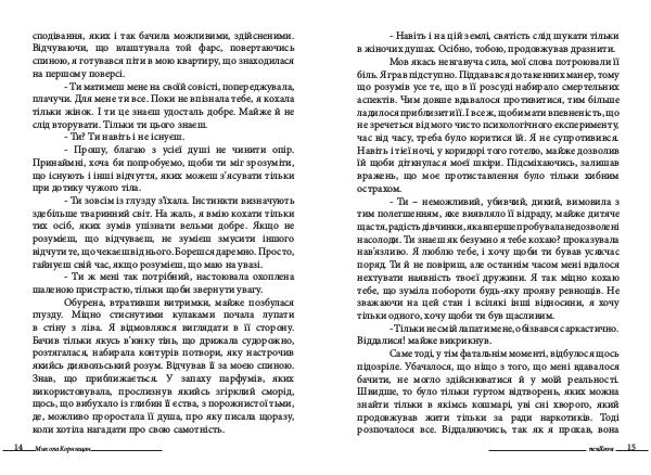 - Ти матимеш мене на своїй совісті, попереджувала, плачучи. Для мене ти все. Поки не впізнала тебе, я кохала тільки жінок. І ти це знаєш удосталь добре. Майже й не слід вторувати. Тільки ти цього знаєш.- Ти? Ти навіть і не існуєш.- Прошу, благаю з усієї душі не чинити опір. Принаймні, хоча би попробуємо, щоби ти міг зрозуміти, що існують і інші відчуття, яких можеш з ' ясувати тільки при дотику чужого тіла.
