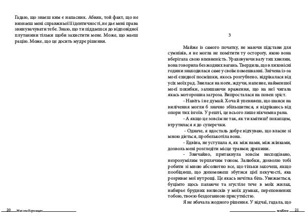 - Звичайно, притакнула зовсім несподівано, незрозумілим терплячим тоном. Залюбки, дозволю тобі робити зі мною абсолютно все, що тільки захочеш, якщо пообіцяєш, що допоможеш збутися цієї пекучості, яка розриває мої нутрощі. Це якась нечітка біль. Увижається, буцімто щось палаюче та згустіле тече в моїх жилах, набирає брудних вилисків у моїх думках, переповнених тобою, твоєю бездоганною присутністю.