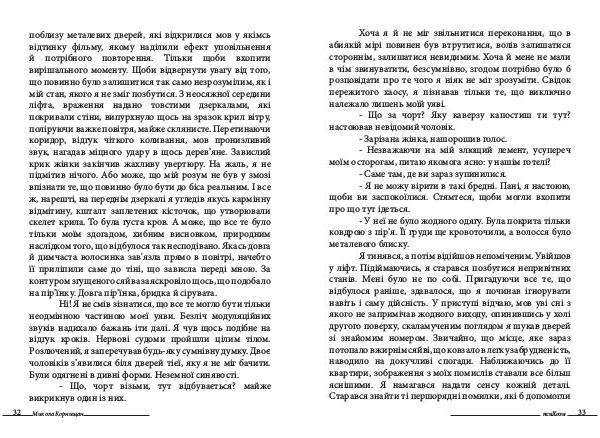 Я тинявся, а потім відійшов непоміченим. Увійшов у ліфт. Підіймаючись, я старався позбутися непривітних станів. Мені було не по собі. Пригадуючи все те, що відбулося раніше, здавалося, що я починав ігнорувати навіть і саму дійсність. У приступі відчаю, мов уві сні з якого не запримічав жодного виходу, опинившись у холі другого поверху, скаламученим поглядом я шукав дверей зі знайомим номером. Звичайно, що місце, яке зараз потопало в жирнім сяйві, що ковзало в легку забрудненість, наводило на докучливі спогади. Наближаючись до її квартири, зображення з моїх помислів ставали все більш яснішими. Я намагався надати сенсу кожній деталі. Старався знайти ті першорядні помилки, які б допомогли псиХози 33