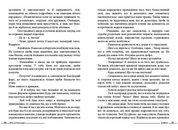 Очевидно, що ще заздалегідь я передрік такі спроби розпочати нові романтичні інтриги, еквівалентні демонстрації жалю, виразистим проявам страждання, якого не могла позбутися.- Ризикуєш зруйнувати все, додав я із сарказмом.- Щось не віриться. Особливо, зараз... Тепер знаєш, що я тобі потрібна, але відмовляєшся визнати це. Не думай, що виню тебе. Розумію досить добре.- На що натякаєш? Щось не можу зрозуміти.- Напрямець? Я жалкую із-за того, що трапилось. Ти маєш абсолютний привілей інкримінувати мене, але ніколи й думалось, що ти міг би дійти саме до цієї межі.- Будь яснішою! Що ти там плутаєш?- Сподіваюся, що в кінці кінців, без жодного натяку зі сторони когось іншого, навіть і вона зрозуміє, що не варта тебе. І тоді покине назавше, дозволить упізнати тільки той побут, якого ти заслуговуєш.- Хочеш скористуватися моїм негараздом?- Ти й насправді думаєш, що я могла би знущатися над твоєю біллю? Чесно? Мені шкода тебе. Щоби не сталося між вами, знай, що ти не заслуговуєш такої долі.