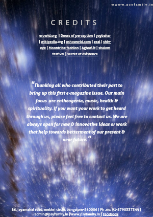 "Thanking all who contributed their part to bring up this first e-magazine issue. Our main focus are entheogenia, music, health & spirituality. If you want your work to get heard through us, please feel free to contact us. We are always open for new & innovative ideas or work that help towards betterment of our present & near future."