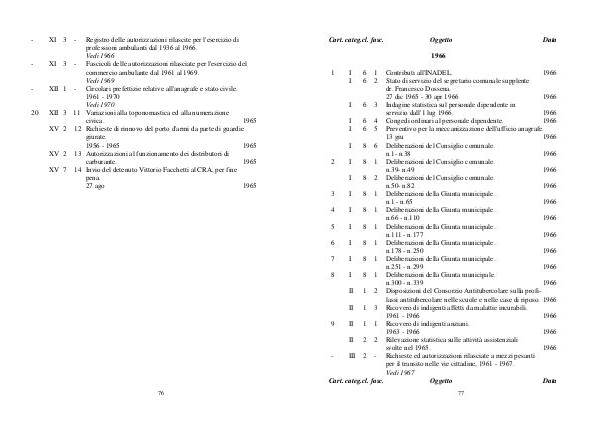 13 giu 1966 I 8 6 Deliberazioni del Consiglio comunale. n. 1- n. 38 1966 2 I 8 1 Deliberazioni del Consiglio comunale. n. 39- n. 49 1966 I 8 2 Deliberazioni del Consiglio comunale. n. 50- n. 82 1966 3 I 8 1 Deliberazioni della Giunta municipale. n. 1- n. 65 1966 4 I 8 1 Deliberazioni della Giunta municipale. n. 66- n. 110 1966 5 I 8 1 Deliberazioni della Giunta municipale. n. 111- n. 177 1966 6 I 8 1 Deliberazioni della Giunta municipale. n. 178- n. 250 1966 7 I 8 1 Deliberazioni della Giunta municipale. n. 251- n. 299 1966 8 I 8 1 Deliberazioni della Giunta municipale. n. 300- n. 339 1966 II 1 2 Disposizioni del Consorzio Antitubercolare sulla profilassi antitubercolare nelle scuole e nelle case di riposo. 1966 II 1 3 Ricovero di indigenti affetti da malattie incurabili.