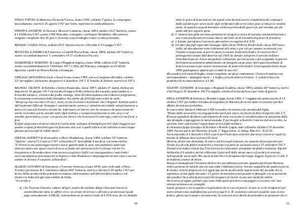 SPIGA GIUSEPPE di Erminio e Brembi Luigia, classe 1893, 1 ° reggimento genio, morto il 15 ottobre 1917 per febbre tifoidea all’ ospedale di Messina dove era stato ricoverato perché affetto da malaria primitiva. In uno scritto datato 6 febbraio 1918 la madre ricostruisce la vicenda del figlio.“ Mossa dalla necessità e incoraggiata dal suo buon cuore, mi faccio ardita rivolgermi alla S. V. Ill. ma pregandola del favore grandissimo di voler accettare in considerazione la posizione della mia famiglia e appoggiare la mia domanda. E per meglio schiarirle il motivo del mio scritto, Le accenno tutti i particolari riguardanti al mio figlio militare. Si chiamava Spiga Giuseppe di Erminio e Brembi Luigia, nato a Rivolta d’ Adda il 15 dicembre 1893. Faceva parte del Distretto di Lodi, 1 ° Regg. Genio, 2a Categ. Mat. 65 – N. 2155. Fu incorporato il 4 dicembre 1915 e partì per Pavia dove si fermò due mesi; trascorsi i quali fu inviato in Albania dove si fermò 18 mesi. Ottenne, dietro sua domanda, di essere iscritto negli aviatori, ma quando doveva partire per Torino fu colto da febbri malariche e rinviato in patria in convalescenza il 17 settembre 1917. Visitato dal medico locale Sig. Tito Carioni fu constatato ammalato da febbre malarica. Ripartì da Rivolta il 4 ottobre, arrivò a Messina il giorno 8 dello stesso mese e fu subito ricoverato nell’ ospedale succursale. Ma causa le fatiche e lo strapazzo del lungo viaggio, il giorno 11 alle 3 di mattina cessava di vivere. Non può immaginare l’ immenso dolore che noi abbiamo provato quando partiti per Messina nella speranza di vederlo ancora una volta l’ abbiamo invece trovato seppellito da quattro giorni. In mezzo a tanto dispiacere vi si aggiunge anche quello della sospensione del sussidio che si aspettava al mio figlio durante i 15 giorni di convalescenza passati in famiglia e la sospensione del sussidio che partecipava io perché incapace al lavoro causa una malattia subita. Ho ricorso, pregato, parlato a persone dalle quali sperava un appoggio o un aiuto, ma non ottenni nemmeno un consiglio. Lascio pensare a Lei se questa è la giustizia che si usa coi poveri. Io non so a chi rivolgermi per avere almeno una soddisfazione, perciò prego V. S. Ill. se potesse ottenere qualche cosa in mio favore; gliene sarò sempre riconoscente. Se sono nei miei diritti di pretendere la pensione che si