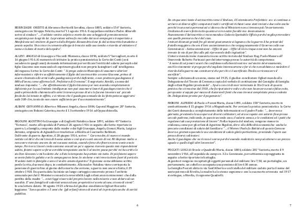 ALLEVI ANGELO di Giuseppe e Viscardi Filomena, classe 1896, soldato 5 ° bersaglieri, morto il 16 giugno 1916. Al momento di istituire la pratica pensionistica la Corte dei Conti( così accadeva in quegli anni) domanda informazioni per verificare l’ entità del salario percepito dal figlio Giacomo non mancando di esprimere giudizi non proprio lusinghieri sull’ intelligenza del ragazzo. Scrive la Corte dei Conti:“ Si prega codesto Municipio di assumere ulteriori informazioni e riferire se effettivamente il figlio del controscritto a nome Giacomo, prima di essere chiamato alle armi nulla guadagnava perché deficiente, o non piuttosto guadagnava £ 800 all’ anno, come afferma la R. Prefettura di Cremona”. Il segretario Airoldi, a nome del sindaco risponde:“… che effettivamente il figlio Giacomo pur non essendo completamente deficiente per la sua limitata intelligenza non può assumersi lavori di guadagno tanto che il padre prima della chiamata alle armi lo teneva presso di sé e lo faceva lavorare sul piccolo fondo da lui tenuto in affitto, e si ritiene che il guadagno annuale da lui fatto potesse aggirarsi sulle 300- lire, tanto da non essere sufficiente per il suo mantenimento”.