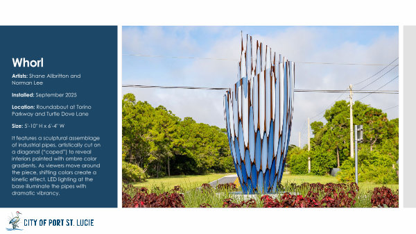 It features a sculptural assemblage of industrial pipes, artistically cut on a diagonal(“ coped”) to reveal interiors painted with ombre color gradients. As viewers move around the piece, shifting colors create a kinetic effect. LED lighting at the base illuminate the pipes with dramatic vibrancy.