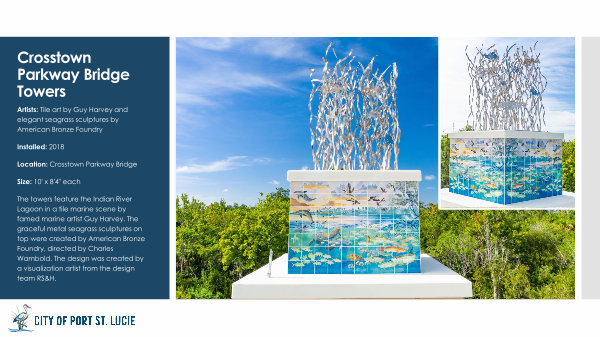 The towers feature the Indian River Lagoon in a tile marine scene by famed marine artist Guy Harvey. The graceful metal seagrass sculptures on top were created by American Bronze Foundry, directed by Charles Wambold. The design was created by a visualization artist from the design team RS & H.