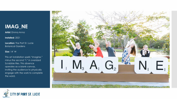 This art installation spells“ imagine,” minus the second“ I,” in oversized Scrabble tiles. This absence operates as a blank canvas, inviting the audience to physically engage with the work to complete the word.