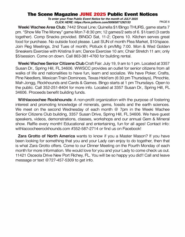 The Scene Magazine JUNE 2025 Public Event Notices To enter your Free Public Event Notice for the month of JULY 2025
