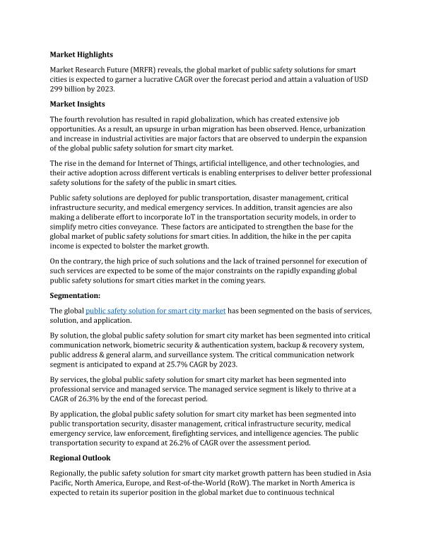 Market Research Future ( MRFR ) reveals , the global market of public safety solutions for smart cities is expected to garner a lucrative CAGR over the forecast period and attain a valuation of USD 299 billion by 2023 .