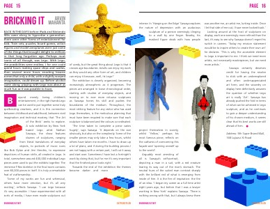 BACK IN THE DAYS before iPads and Nintendo Wiis came along to hypnotise a generation, there were other forms of entertainment for kids. Train sets, puzzles, board games, action figures and model aeroplanes were just some of the things that brought delight to millions in that long forgotten age. Perhaps most iconic of all though, was Lego. With Lego, the possibilities were endless. I for one could spend hours making space ships and castles, then several more hours enacting bizarre scenes that only a child, with a slightly warped imagination, could dream up. Before alcohol came along, playing with Lego was about as much fun as it was possible to have. eyond merely being children’s entertainment, in the right hands Lego can be used to put together some truly spellbinding creations, and it is this connection between childhood and adulthood, between vivid imagination and technical mastery, that ‘The Art of the Brick’ seeks to explore. A solo exhibition by New York based Lego artist Nathan Sawaya, the show features dozens of sculptures, ranging from literal translations of everyday objects, to portraits of music icons like Bob Dylan and Jimi Hendrix, to expressive depictions of human strife, all created in Lego. In total, somewhere around 400,000 individual Lego pieces were used to put the exhibits together. The immense T-Rex skeleton in the final room contains over 80,000 pieces in itself. It is truly a remarkable feat of craftsmanship. ? ‘Some of my works are fun and whimsical, others have more emotion, but it’s all very exciting’, reflects Sawaya. ‘I use Lego because it’s very accessible. I have experimented with all sorts of media, I have even made sculptures out