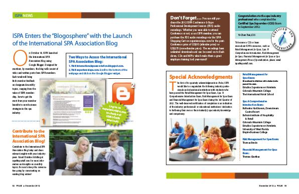 The first of its quarterly acknowledgments in Pulse, ISPA would like to congratulate the following industry professionals and educational institutions with students who have passed the Retail Management for Spas Exam, Spa: A Comprehensive Introduction Exam, Risk Management for Spas Exam and Financial Management for Spas Exam during the 3rd Quarter of 2012. The well-deserved certification of completion is an indication of the industry professionals’ or educational institutions’ dedication to furthering their own or their student( s) spa industry knowledge and competency.