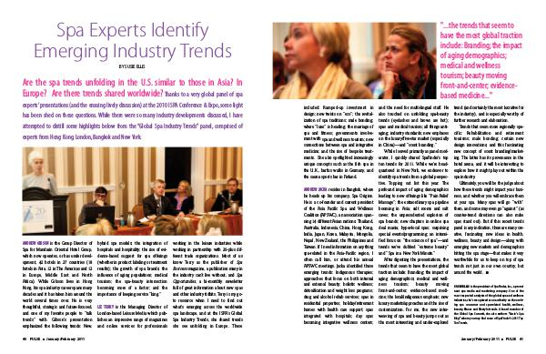 "... the trends that seem to have the most global traction include: Branding; the impact of aging demographics; medical and wellness tourism; beauty moving front-and-center; evidencebased medicine..." included: Ramped-up investment in design; new twists on“ eco”; the revitalization of spa traditions; male bonding; where“ luxe” is heading; the marriage of spa and fitness; governments involvement with spa and wellness tourism; new connections between spa and integrative medicine; and the rise of bespoke treatments. She also spotlighted increasingly unique concepts such as the fish spa in the U. K., barfus walks in Germany, and the sauna sports bar in Finland.