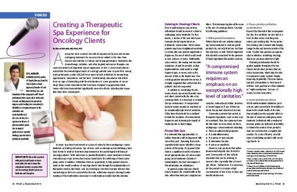 Catering to Oncology Clients Prior to performing any spa services, estheticians should be aware if a client is undergoing cancer treatment. For this reason, a section of the new client questionnaire should inquire about an individual’ s cancer status. Active cancer patients may have a heightened sensitivity to certain skin-care product ingredients or fragrances, the use of which could result in rash, redness, or worse. Additionally, some services, like waxing and microdermabrasion, should be avoided, as their implementation could result in a high degree of pain, or worse, such as the removal of skin in the treated area. If an oncology patient demands the service, it is highly suggested that a letter from the patient’ s doctor be requested.