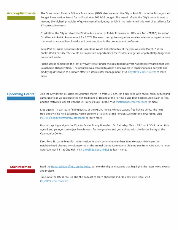 The Government Finance Officers Association( GFOA) has awarded the City of Port St. Lucie the Distinguished Budget Presentation Award for its Fiscal Year 2025-26 budget. The award reflects the City’ s commitment to meeting the highest principles of governmental budgeting, which it has maintained this level of excellence for 37 consecutive years.