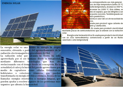 •Energía solar fotovoltaica: Es usada para producir electricidad mediante placas de semiconductores que se alteran con la radiación solar.