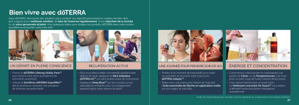 Avec dōTERRA , découvrez des solutions pour soutenir vos objectifs personnels en matière de bien-être , qu ’ il s ’ agisse d ’ une meilleure nutrition , de faire de l ’ exercice régulièrement , d ’ une réduction de la toxicité ou de soins personnels éclairés . Voici quelques idées pour intégrer les produits dōTERRA dans votre routine quotidienne et booster votre bien-être :