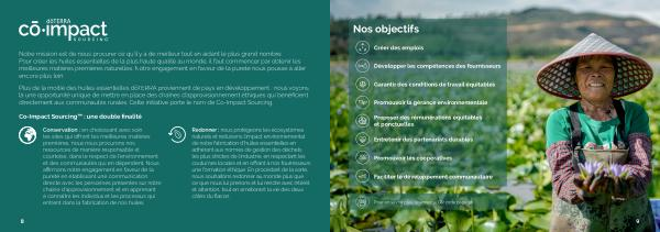 Plus de la moitié des huiles essentielles dōTERRA proviennent de pays en développement : nous voyons là une opportunité unique de mettre en place des chaînes d ’ approvisionnement éthiques qui bénéficient directement aux communautés rurales . Cette initiative porte le nom de Co-Impact Sourcing .