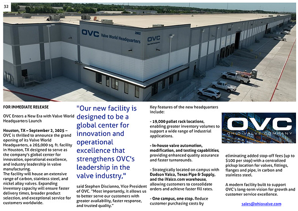 Houston, TX – September 2, 2025 – OVC is thrilled to announce the grand opening of its Valve World Headquarters, a 265,000 sq. ft. facility in Houston, TX designed to serve as the company's global center for innovation, operational excellence, and industry leadership in valve manufacturing.