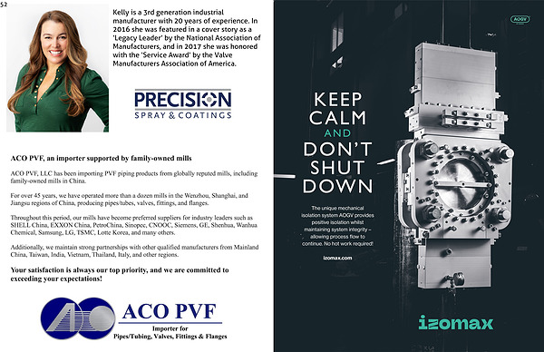 Kelly is a 3rd generation industrial manufacturer with 20 years of experience. In 2016 she was featured in a cover story as a ‘Legacy Leader’ by the National Association of Manufacturers, and in 2017 she was honored with the ‘Service Award’ by the Valve Manufacturers Association of America.