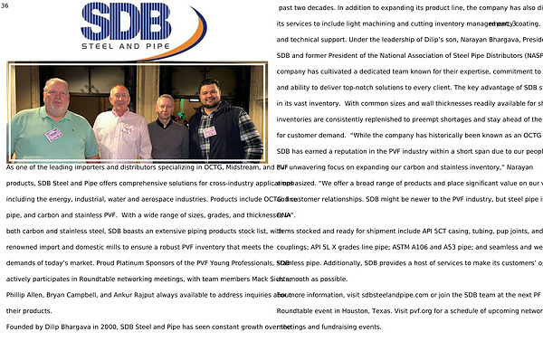 As one of the leading importers and distributors specializing in OCTG, Midstream, and PVF products, SDB Steel and Pipe offers comprehensive solutions for cross-industry applications including the energy, industrial, water and aerospace industries. Products include OCTG, line pipe, and carbon and stainless PVF. With a wide range of sizes, grades, and thicknesses in both carbon and stainless steel, SDB boasts an extensive piping products stock list, with renowned import and domestic mills to ensure a robust PVF inventory that meets the demands of today’s market. Proud Platinum Sponsors of the PVF Young Professionals, SDB actively participates in Roundtable networking meetings, with team members Mack Sichta, Phillip Allen, Bryan Campbell, and Ankur Rajput always available to address inquiries about their products.