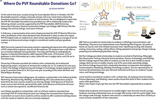 San Jacinto College focused their scholarship donations to Inspection technologies, Instrumentation, Pipefitting, Welding Technology students. San Jac reported plans to hand out 80 scholarships next year (40 each semester) and focus on students in pipe, valve, and fitting technology