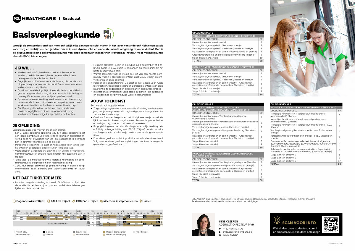Word jij de zorgprofessional van morgen? Wil jij elke dag een verschil maken in het leven van anderen? Heb je een passie voor zorg en welzijn en ben je klaar om je in een dynamische en ondersteunende omgeving te ontwikkelen? Dan is de graduaatsopleiding Basisverpleegkunde van onze samenwerkingspartner Provinciaal Instituut voor Verpleegkunde Hasselt( PIVH) iets voor jou!