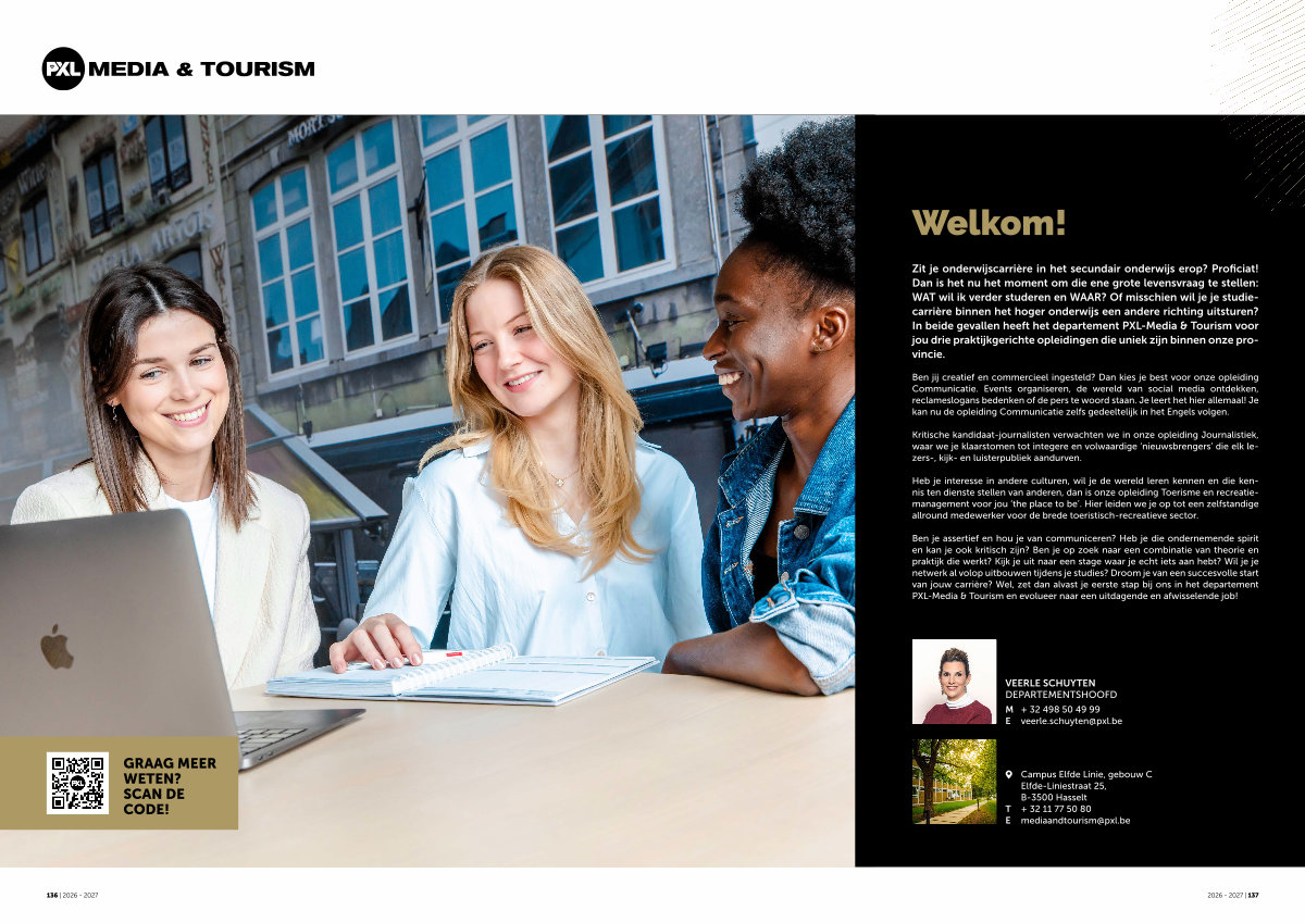 Ben je assertief en hou je van communiceren? Heb je die ondernemende spirit en kan je ook kritisch zijn? Ben je op zoek naar een combinatie van theorie en praktijk die werkt? Kijk je uit naar een stage waar je echt iets aan hebt? Wil je je netwerk al volop uitbouwen tijdens je studies? Droom je van een succesvolle start van jouw carrière? Wel, zet dan alvast je eerste stap bij ons in het departement PXL-Media & Tourism en evolueer naar een uitdagende en afwisselende job!