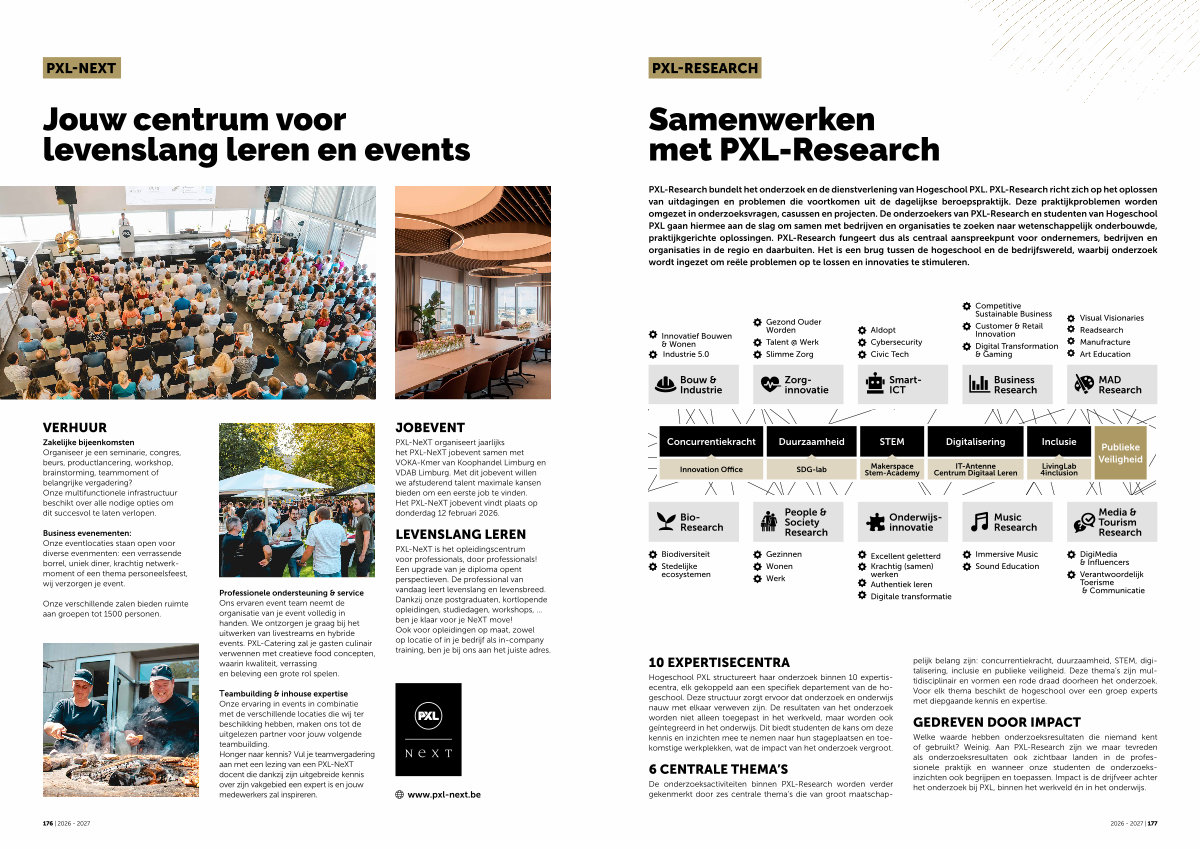 Hogeschool PXL structureert haar onderzoek binnen 10 expertisecentra, elk gekoppeld aan een specifiek departement van de hogeschool. Deze structuur zorgt ervoor dat onderzoek en onderwijs nauw met elkaar verweven zijn. De resultaten van het onderzoek worden niet alleen toegepast in het werkveld, maar worden ook geïntegreerd in het onderwijs. Dit biedt studenten de kans om deze kennis en inzichten mee te nemen naar hun stageplaatsen en toekomstige werkplekken, wat de impact van het onderzoek vergroot.