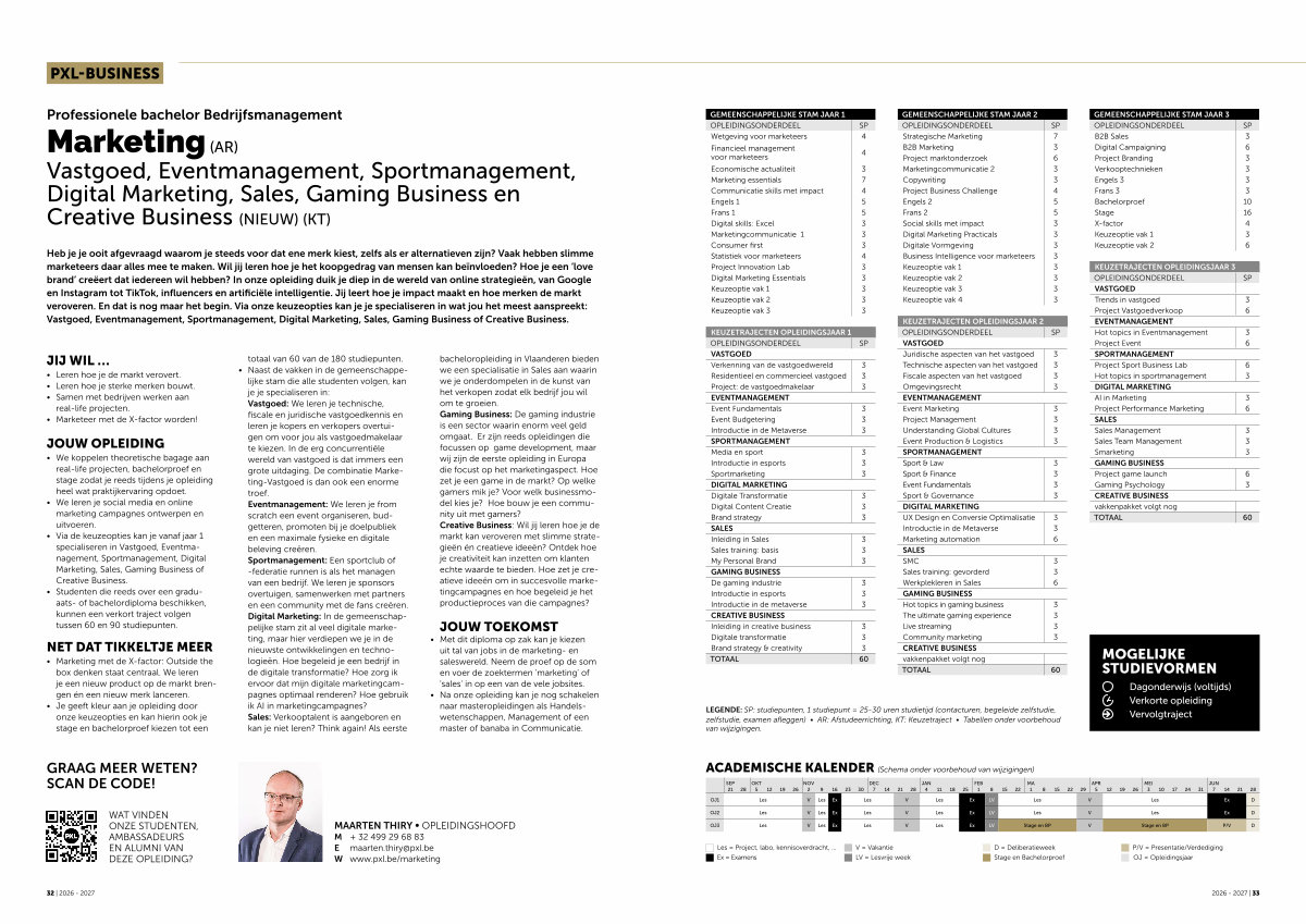• Naast de vakken in de gemeenschappelijke stam die alle studenten volgen, kan je je specialiseren in: Vastgoed: We leren je technische, fiscale en juridische vastgoedkennis en leren je kopers en verkopers overtuigen om voor jou als vastgoedmakelaar te kiezen. In de erg concurrentiële wereld van vastgoed is dat immers een grote uitdaging. De combinatie Marketing-Vastgoed is dan ook een enorme troef. Eventmanagement: We leren je from scratch een event organiseren, budgetteren, promoten bij je doelpubliek en een maximale fysieke en digitale beleving creëren. Sportmanagement: Een sportclub of-federatie runnen is als het managen van een bedrijf. We leren je sponsors overtuigen, samenwerken met partners en een community met de fans creëren. Digital Marketing: In de gemeenschappelijke stam zit al veel digitale marketing, maar hier verdiepen we je in de nieuwste ontwikkelingen en technologieën. Hoe begeleid je een bedrijf in de digitale transformatie? Hoe zorg ik ervoor dat mijn digitale marketingcampagnes optimaal renderen? Hoe gebruik ik AI in marketingcampagnes? Sales: Verkooptalent is aangeboren en kan je niet leren? Think again! Als eerste bacheloropleiding in Vlaanderen bieden we een specialisatie in Sales aan waarin we je onderdompelen in de kunst van het verkopen zodat elk bedrijf jou wil om te groeien. Gaming Business: De gaming industrie is een sector waarin enorm veel geld omgaat. Er zijn reeds opleidingen die focussen op game development, maar wij zijn de eerste opleiding in Europa die focust op het marketingaspect. Hoe zet je een game in de markt? Op welke gamers mik je? Voor welk businessmodel kies je? Hoe bouw je een community uit met gamers? Creative Business: Wil jij leren hoe je de markt kan veroveren met slimme strategieën én creatieve ideeën? Ontdek hoe je creativiteit kan inzetten om klanten echte waarde te bieden. Hoe zet je creatieve ideeën om in succesvolle marketingcampagnes en hoe begeleid je het productieproces van die campagnes?