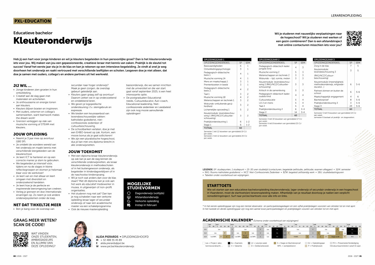 Wie wil starten aan een educatieve bacheloropleiding kleuteronderwijs, lager onderwijs of secundair onderwijs in een hogeschool in Vlaanderen, moet de starttoets( en) lerarenopleiding maken. Afhankelijk van je resultaat doorloop je nadien een verplicht remediëringstraject. Surf naar pxl. be / starttoets voor alle info en links.