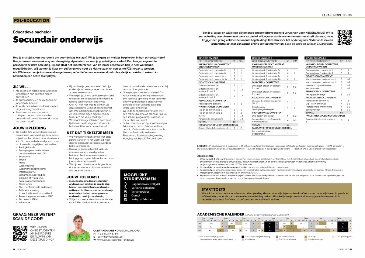 Ben je al leraar en wil je een bijkomende onderwijsbevoegdheid verwerven voor NEDERLANDS? Wil je een opleiding combineren met werk en gezin? Wil je jouw studiemomenten maximaal zelf plannen, maar krijg je toch graag voldoende( online) begeleiding? Kies dan voor het onderwijsvak Nederlands via een afstandstraject met een aantal online contactmomenten. Scan de code en ga naar‘ Studievorm’.