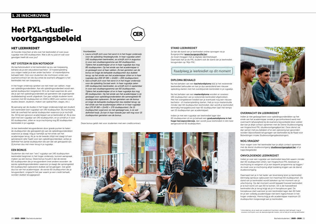 Voor vragen over het leerkrediet kan je altijd contact opnemen met de dienst studievoortgang( studievoortgang @ pxl. be) of je trajectbegeleider.
